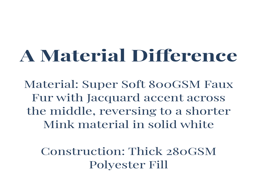 - Material: Super Soft 800GSM Faux Fur with Jacquard accent across the middle, reversing to a shorter Mink material in solid white