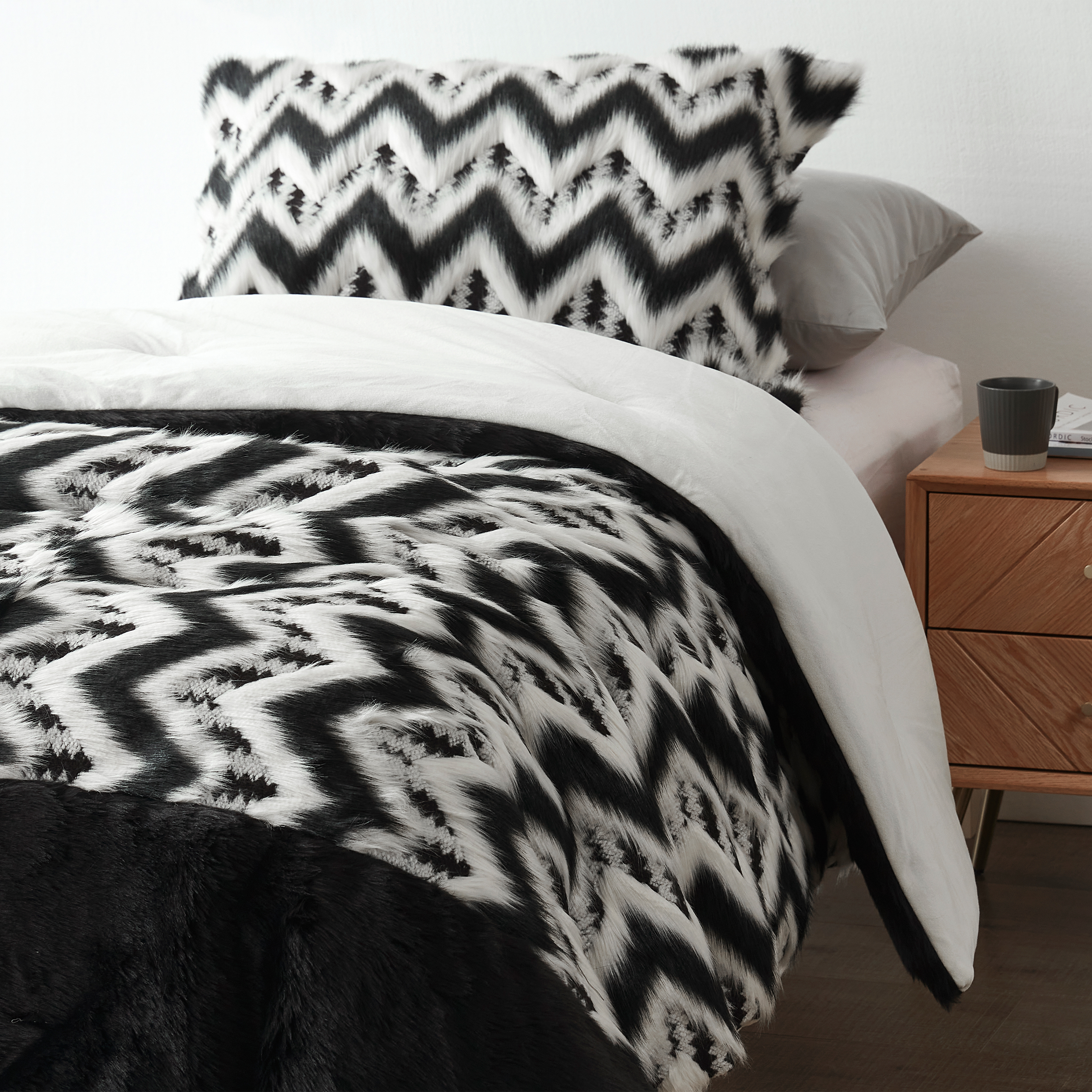 With an eccentric black and white chevron pattern and different attention-grabbing textures, this avant garde Twin XL, Queen, or King oversized comforter set is sure to be the center of attention in your bedroom decor. And with our plush faux fur reversing to snuggly soft micromink, we couldn’t think of a cozier combination for luxury Twin XL, Queen, or King extra large bedding essentials. The extended dimensions of this Twin XL, Queen, or King supersized comforter set will reach over every edge of your mattress for a chic oversized look that is only possible with oversized designer Twin XL, Queen, or King bedding. And with a thicker than average inner fill, this extra large Twin XL, Queen, or King comforter set won’t just add an extravagant style to your bedroom decor, but will also surprise you with just how cozy a decorative Twin XL, Queen, or King bedspread could be.
