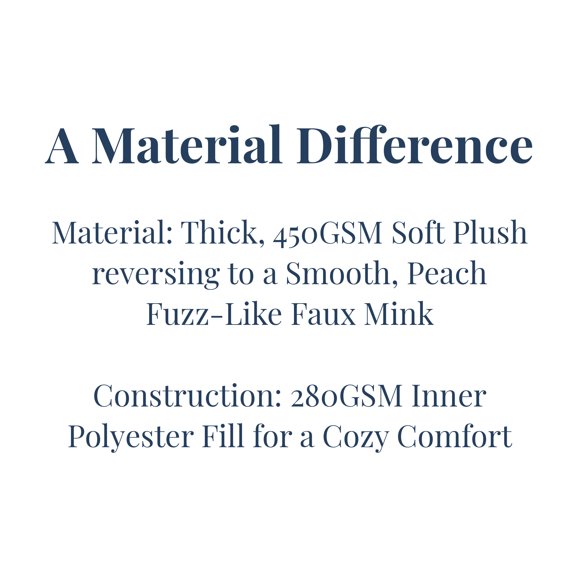 - Material: Thick, 450GSM Soft Plush reversing to a Smooth, Peach Fuzz-Like Faux Mink