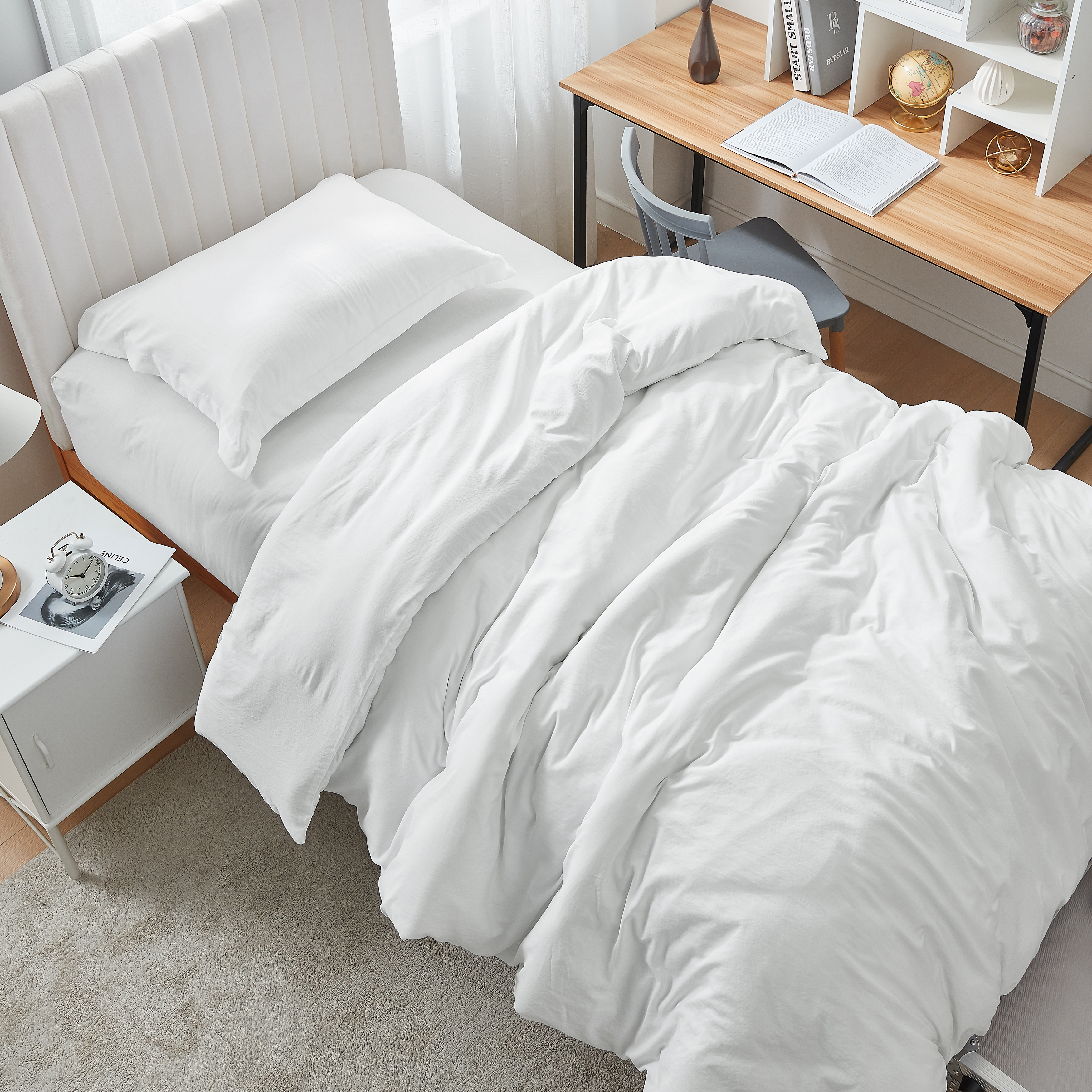 This ultra thick comforter is filled with down alternative, so you can get warm and cozy on your Twin XL, Queen, or King size bed without overheating. This cozy down alternative material is encased by a removable microfiber cover that further enhances the amazing comfort of this one of a kind extra long Twin, Queen, or King oversize comforter. The unique pre-washed microfiber material of this useful cover will give you super soft Twin XL, Queen, or King bedding that you will love to snuggle up in. This removable cover also gives you the chance to enjoy the look of white extra long Twin, Queen, or King bedding without the worry of it looking dirty after a few uses. Just pop this machine washable cover in your washing machine and use it to encase your Twin XL, Queen, or King XL comforter when clean to get your white bedding looking good as new!