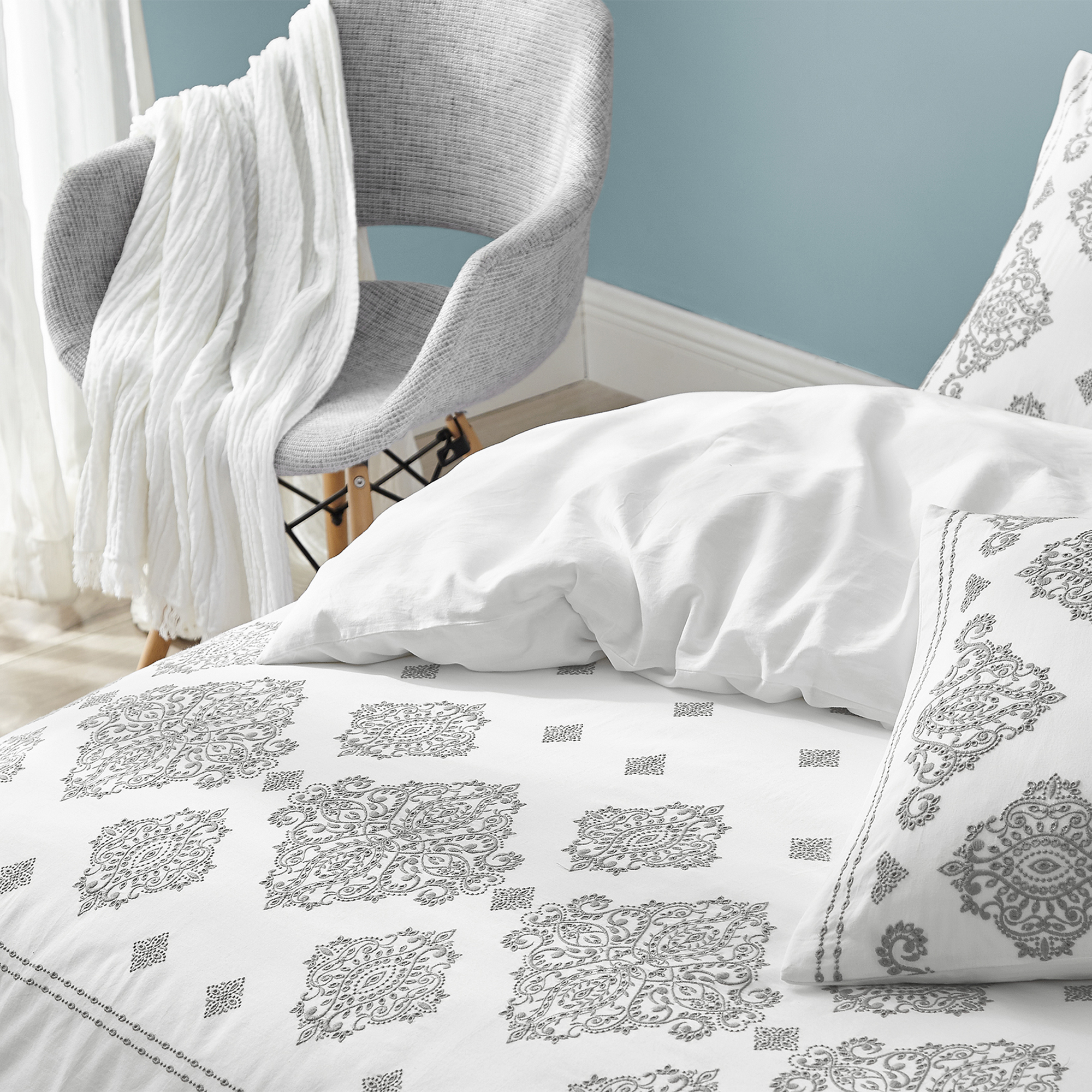 Complete with an extra large Twin comforter and a matching standard size pillow sham, this one of a kind XL Twin bedding set is a simple way to add intricate style to your bedroom! The ornate gray details that decorate each piece in this Twin XL comforter set are enough to add undeniable design to your bedroom decor, but there is more to this fashionable Twin extra large comforter when it comes to style. This intricate pattern is made up with embroidered details, giving the gray designs new life. Oversized Twin XL comforters that feature a textured pattern will add unmatched style to your Twin or XL Twin sized bed that will resonate with the rest of your bedroom decor for the best looking bedroom!