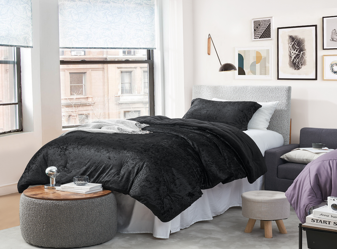 If you love all black bedroom decor, it can be difficult to find a Twin XL, Queen, or King oversized bedding set that stands out among your other dark bedroom accessories. Embracing unique textures and high quality bedding materials can give your designer Twin XL, Queen, or King comforter set a little extra personality! And if you want your solid black bedding to truly make a statement, there is no better choice than our Velvet Crush - Coma Inducer® Oversized Comforter - Champagne Black. This black Twin XL, Queen, or King luxury bedding set features an eye-catching crushed velvet face, with an ultra cozy plush reverse. These complimentary bedding materials combine to create a plush Twin XL, Queen, or King extra large comforter set that provides both glamorous bedroom decor as well as irresistible coziness. Included black velvet pillow sham(s) ensure every inch of your Twin XL, Queen, or King size mattress is covered in this beautiful bedding from our exclusive Coma Inducer® bedding brand.