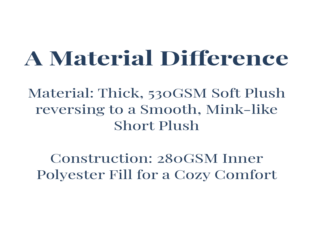 - Material: Thick, 530GSM Soft Plush reversing to a Smooth, Mink-like Short Plush
