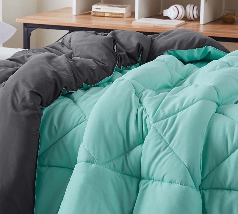 The blue green side of this Twin XL reversible comforter adds eye-catching color to your bedroom decor, giving your bedroom a fun and vibrant atmosphere. Looking for a more toned down look? Just flip this machine washable microfiber comforter over and you automatically have an easy to match gray Twin XL comforter on your extra large Twin bed! No matter which side of this oversized Twin comforter you choose, you'll enjoy the soft touch of cozy bedding that will help you get a great night's sleep.