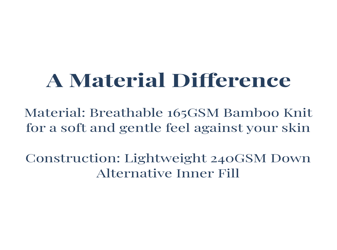 Inspired by combining two incredible things to make something beautiful. Imagine the Bamboo Forests of Japan coming together with the Glaciers of Antarctica. Two impressive things on their own, yet the thought of them being fused together brings a completely new meaning to being awestruck. At Coma Inducer® we like to think of ourselves as bedding artists. Your bed is our canvas to create a masterpiece that provides a sleep experience that is truly Coma Worthy. With our Bamboo Glacier Coma Inducer® you'll enjoy the cozy plush softness of the inner Down Alternative filling coupled with the double sided 165GSM Knitted Bamboo material that is a rare combination of coziness and cool. Use this Bamboo Glacier Coma Inducer® year-round or for certain seasons depending on your sleep temperature. No matter what you do, your bed won't just gain a beautiful Coma Inducer®, but it will also gain a comfort you didn't know was possible!