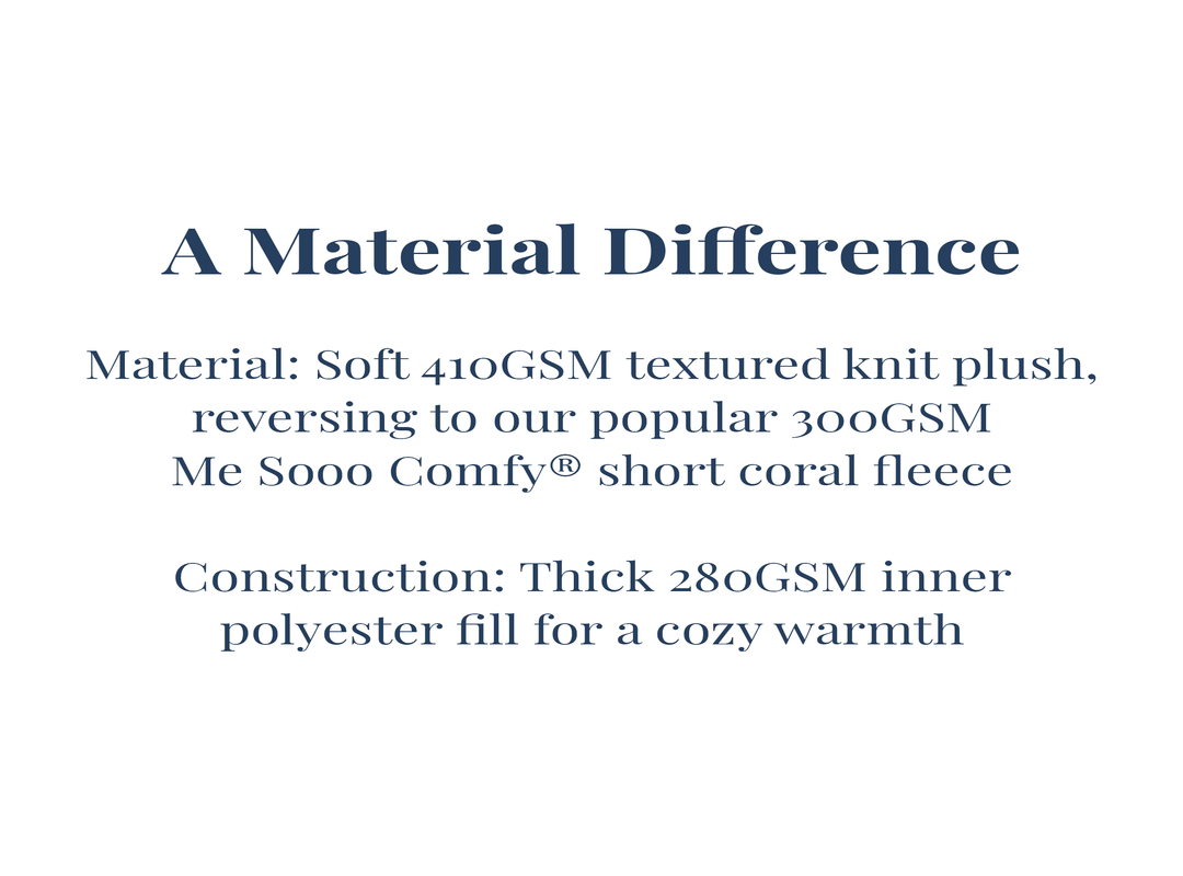Inspired by that cozy feeling of bundling up in your favorite winter sweater. Maybe you've noticed that Coma Inducer® has taken an inspiration or two from the world of clothing. You spend almost as much time in bed as you do out and about, so it's only fair that your bed gets the best materials. With our Cardigan Knit Coma Inducer® we used the actual knit plush that is used to make high quality sweaters. Always opting for faux fur, the 410GSM sweater style plush makes our Cardigan Knit Coma Inducer® an authentic representation of its name. To take our Cardigan Knit to the next level, we elected to use our 300GSM Me Sooo Comfy® plush flannel as the reverse material that rests against your skin. This combination gives you the textured sweater softness on the front and a smooth cozy plushness on the back. And beyond the exterior you'll find the Down Alternative inner filling provides extra next level warmth and squeezable comfort that's hard to resist. So if you sometimes fall asleep in your favorite winter sweater because you love its comfy warmth you can experience an upgrade to that coziness with our oversized Cardigan Knit Coma Inducer®.