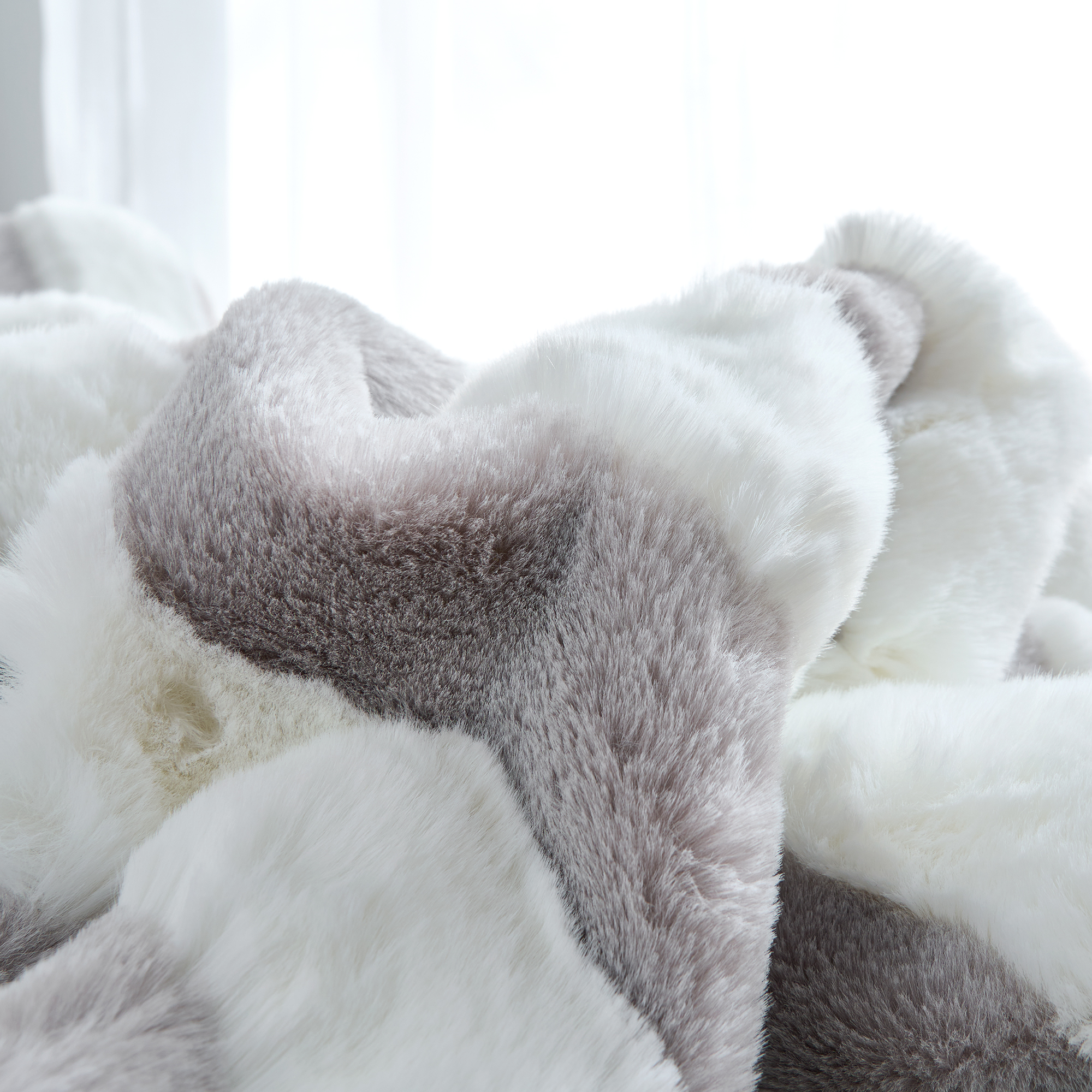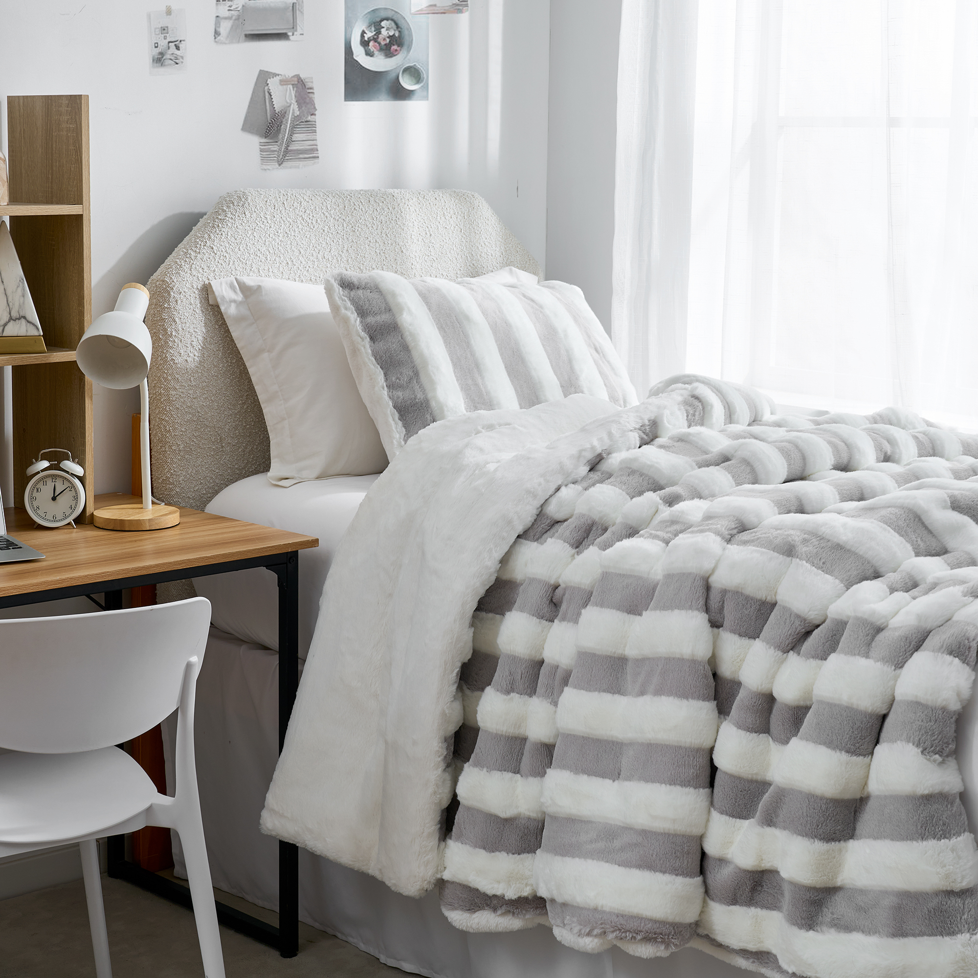 The white and light gray striped textured plush is crafted from premium faux rabbit fur for an ultra soft hand feel. This thick Chunky Bunny® faux fur bedding material provides exceptional warmth, keeping you shielded from cold winter nights. For plush comfort on both sides, this XL Twin plush comforter reverses to a solid white faux fur plush, ensuring cozy, high quality softness no matter how you use it.