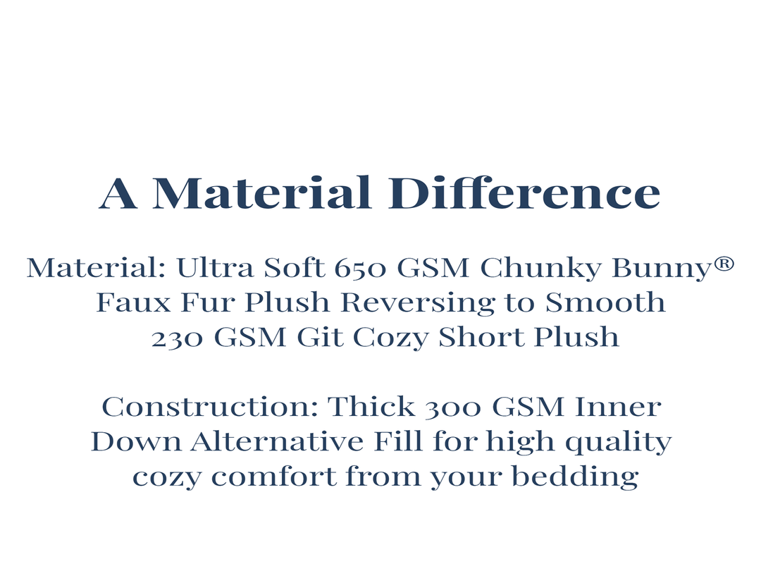 Inspired by two very important things: Coma Inducer’s move from Buffalo, NY to Nashville, TN and soft, overly plump bunnies that make you want to hold and caress them against your skin. It might seem like a weird combo, but let us explain. Our Chunky Bunny® is as real as it gets without being real (because that would be sad). That means that we’ve selected the softest faux fur plush to make this 650 GSM oversized comforter. That explains the bunnies, but where did “Git Cozy” come from? Country music and some southern twang from Nashville helped us adjust our "Get" to "Git", while the "Cozy" portion was already the heart and soul of who we are. The reverse 230 GSM milk flannel makes it even easier to “Git Cozy” with this plush comforter that has a 300 GSM Down Alternative Fill. This is the perfect Coma Inducer® that embodies the comforts of home and allows you to indulge in Bunny Heaven.