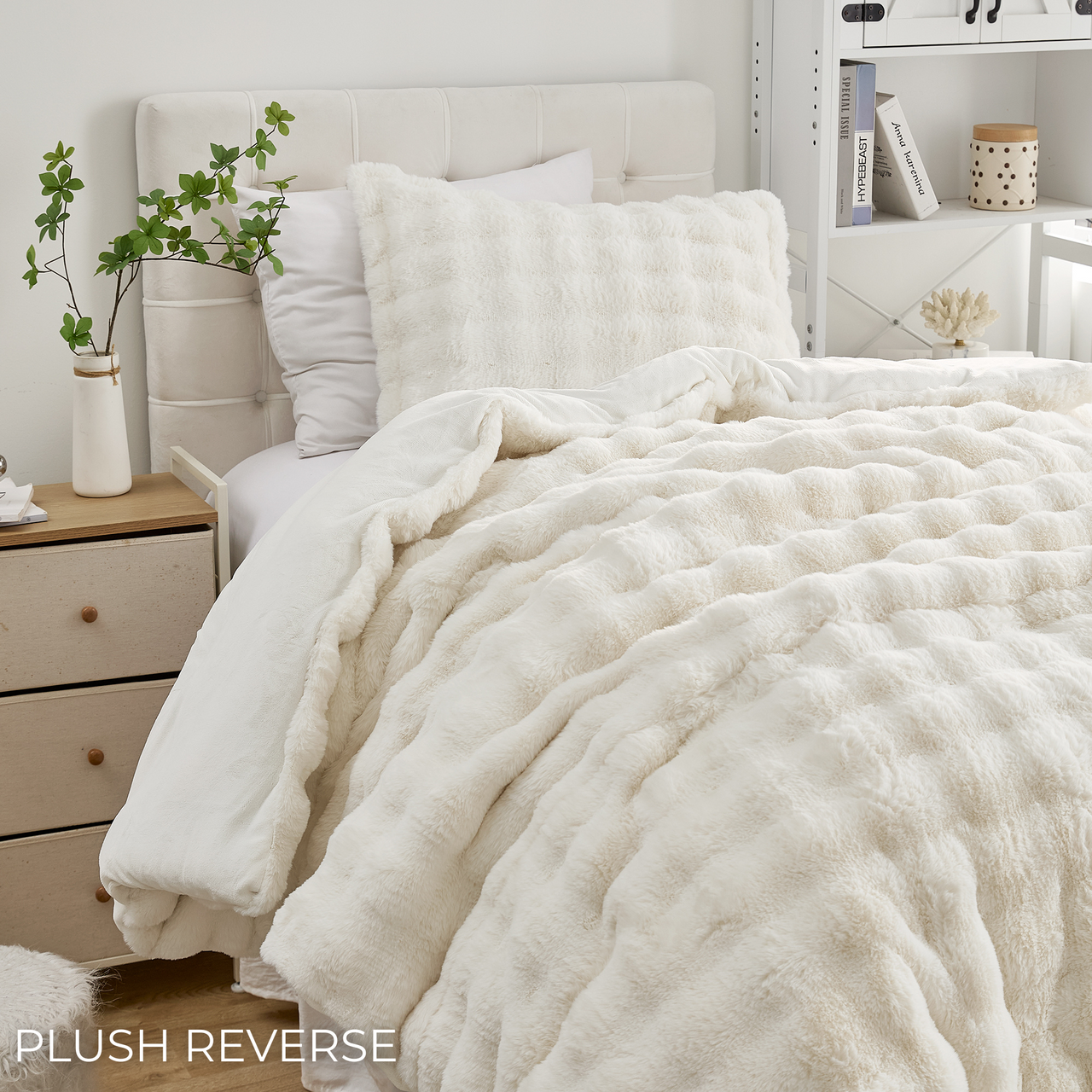 Inspired by the ideal level of cozy that lets you enjoy the fun of winter. Winter's not all bad with cozy fireplaces, hot chocolate, skiing, and snowball fights, but feeling cold (especially at night) definitely makes it hard to look forward to winter. Dreaming of winter fun and the quest to stay warm, we took our beloved Chunky Bunny® material and created a snowball-like textured pattern to give your bedroom the feeling of a winter wonderland. Chunky Bunny® on a Snowday looks like a field of fluffy snowballs but adds the warmest and coziest comfort to your winter bedding. Choose between the 780 GSM faux fur with Softer Than Soft® Plush Reverse for ultimate comfort with half the heat, or give in to your need for next level bedding with the Chunky Bunny® Reverse! This option is double-sided, giving you 2X the irresistibly soft Chunky Bunny® faux fur material! You can’t go wrong with either choice, no matter which plush comforter you choose, it’s sure to help you have a Happy Winter. :)