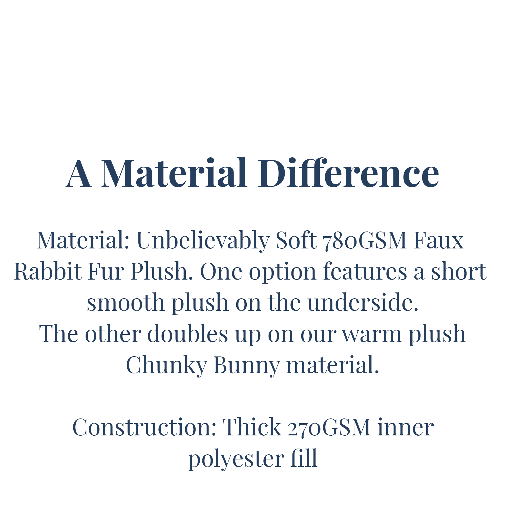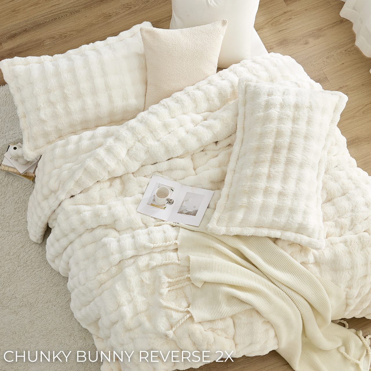 Inspired by the ideal level of cozy that lets you enjoy the fun of winter. Winter's not all bad with cozy fireplaces, hot chocolate, skiing, and snowball fights, but feeling cold (especially at night) definitely makes it hard to look forward to winter. Dreaming of winter fun and the quest to stay warm, we took our beloved Chunky Bunny® material and created a snowball-like textured pattern to give your bedroom the feeling of a winter wonderland. Chunky Bunny® on a Snowday looks like a field of fluffy snowballs but adds the warmest and coziest comfort to your winter bedding. Choose between the 780 GSM faux fur with Softer Than Soft® Plush Reverse for ultimate comfort with half the heat, or give in to your need for next level bedding with the Chunky Bunny® Reverse! This option is double-sided, giving you 2X the irresistibly soft Chunky Bunny® faux fur material! You can’t go wrong with either choice, no matter which plush comforter you choose, it’s sure to help you have a Happy Winter. :)