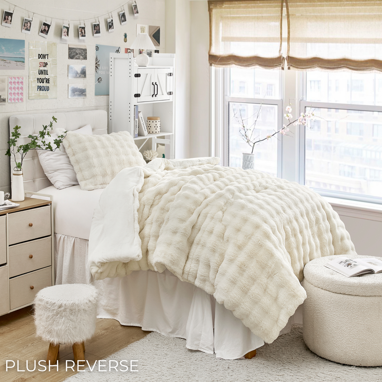 Inspired by the ideal level of cozy that lets you enjoy the fun of winter. Winter's not all bad with cozy fireplaces, hot chocolate, skiing, and snowball fights, but feeling cold (especially at night) definitely makes it hard to look forward to winter. Dreaming of winter fun and the quest to stay warm, we took our beloved Chunky Bunny® material and created a snowball-like textured pattern to give your bedroom the feeling of a winter wonderland. Chunky Bunny® on a Snowday looks like a field of fluffy snowballs but adds the warmest and coziest comfort to your winter bedding. Choose between the 780 GSM faux fur with Softer Than Soft® Plush Reverse for ultimate comfort with half the heat, or give in to your need for next level bedding with the Chunky Bunny® Reverse! This option is double-sided, giving you 2X the irresistibly soft Chunky Bunny® faux fur material! You can’t go wrong with either choice, no matter which plush comforter you choose, it’s sure to help you have a Happy Winter. :)