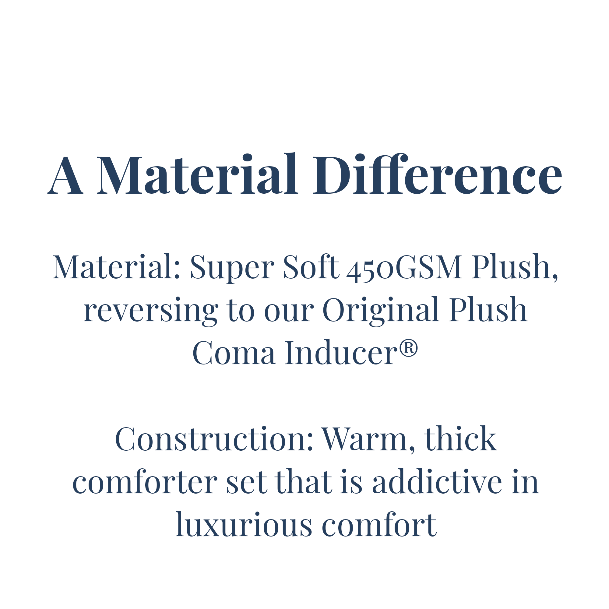 Inspired by pairing the BEST of the BEST to create the dream Collab. Our Original Coma Inducer® is our #1 best-selling Coma Inducer® each year and our Chunky Bunny® is our fan favorite Coma Inducer® that provides the WOW factor. Chunky Bunny® faux fur plush is the material that makes jaws drop and makes the term 'Coma Inducing' feel like a real possibility! Now, we've taken these two amazing materials and paired them together (Chunky Bunny x Original)... two heavyweight titans... It's the Superbowl of Plush! Now who doesn't want to see (I mean touch) that! It's quite possibly the greatest combination and collaboration of all time. Once you try Chunky Bunny x Original Coma Inducer you'll see what all the hype is about! You can tell by our inspiration alone that this is a BIG deal. The silky smooth and thick plush of our 450 GSM Chunky Bunny® combined with the wavy ultra soft plush of our 280 GSM Original is the ultimate in oversized, Coma Worthy Sleep® plush bedding! Best + Best = BESTEST