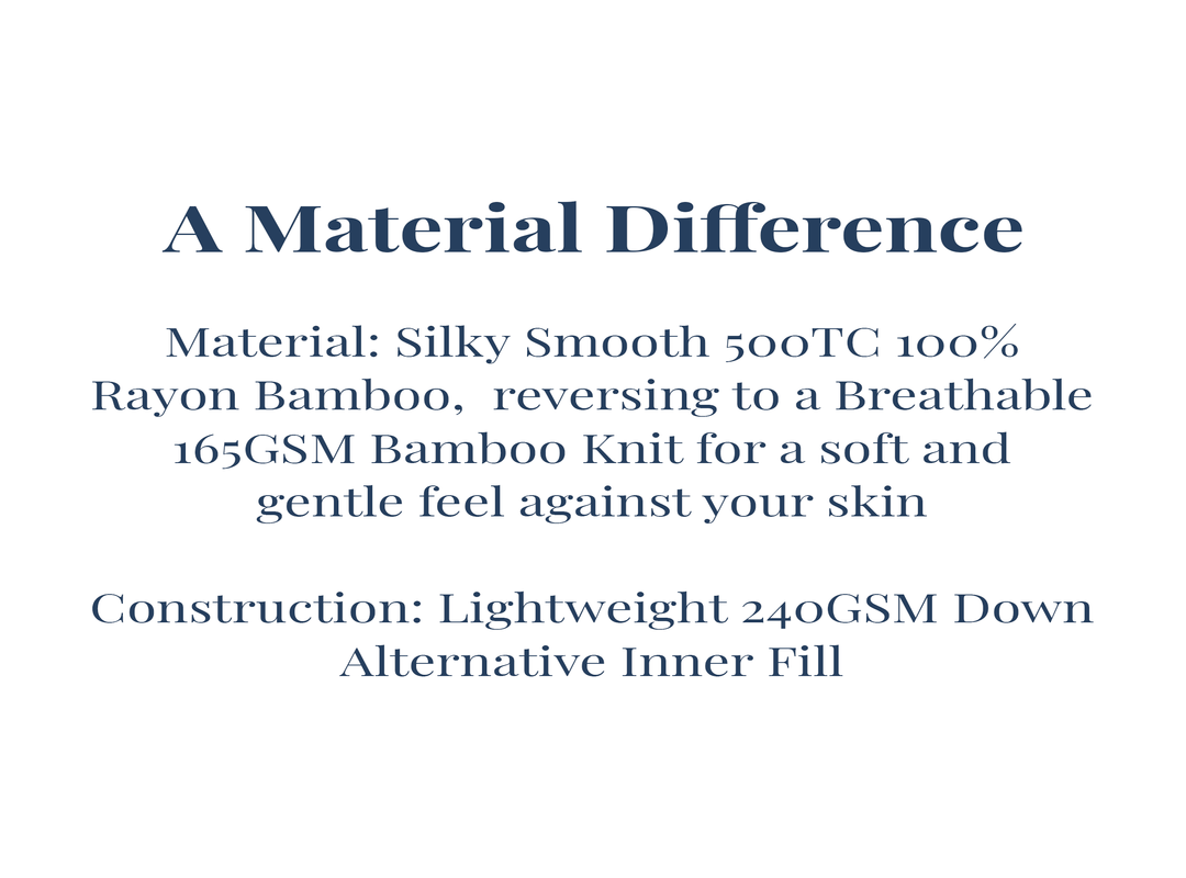 Inspired by a wild imagination. A level of creativity that can only come once you feel peacefully well rested. You know, that kind of inspiration that might seem a little wacky to others, but to you it makes perfect sense. Or the type that evokes a silly sense of humor because you are in a good mood that can best be attributed to a great night's sleep. It's all connected. Great sleep = happy mood = brain firing up good ideas = more imaginative. Achieving that Coma Worthy Sleep® is a personal journey that involves many factors. What we can tell you is that Cold Pandas Knitting comes from that special place we all have inside us that simply allows our imagination to run free. Our all season / Summer Cold Pandas Knitting Coma Inducer® is made of 500TC 100% Bamboo on one side with a reverse side of 165GSM Knitted Bamboo. The differing bamboo materials actually serve an important purpose. The 500TC Bamboo provides your silky smooth, cool to the touch Summer comfort, while the 165GSM Knitted Bamboo provides more of a plushie soft cozy comfort. Paired together you get the cool bamboo you crave without having to give up the soothing plush either! Made of a Down Alternative inner fill for squishy softness, this oversized comforter will have you dreaming of Cold Pandas Knitting as you wonder how you possibly fell asleep before this Coma Inducer®.