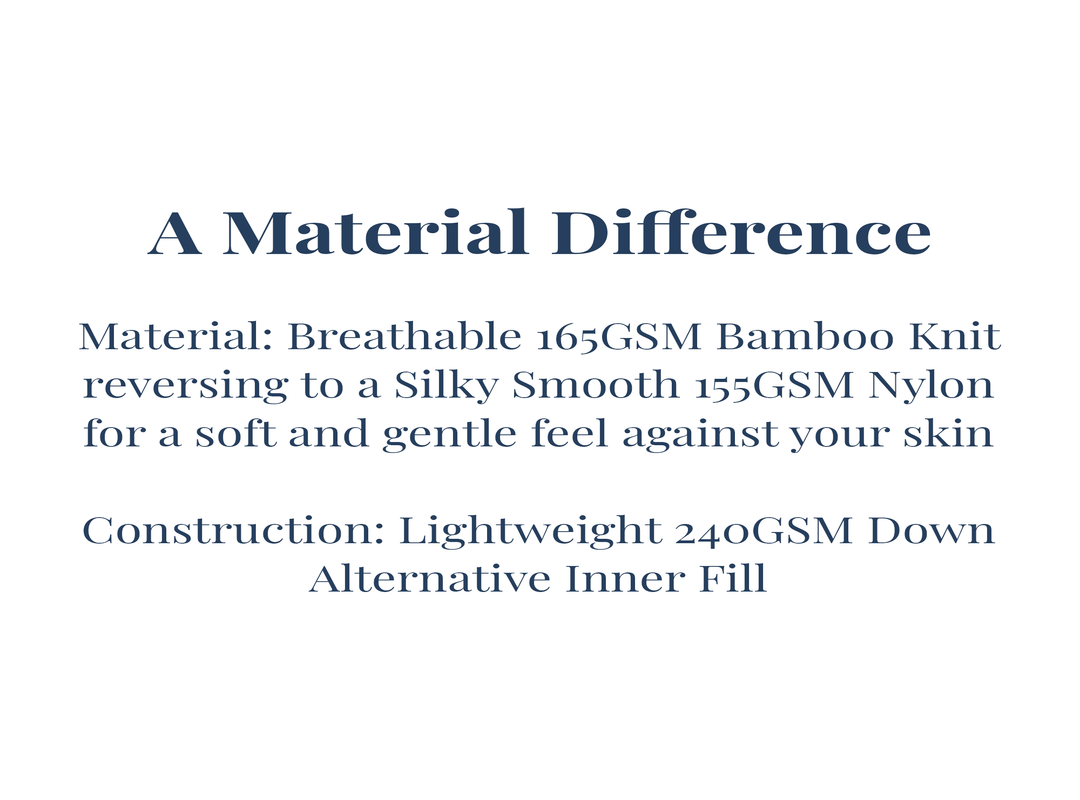 Inspired by a special group of people (maybe you) that run too warm while they sleep. We present to all you warm sleepers out there... Cover Me Cold. You know who you are... maybe you pump the AC to 62° or crack a window in the winter or literally start to sweat at the sight of our Thicker Than Thick Coma Inducers®. Interestingly enough, even warm sleepers like to be covered up while sleeping. Have you ever met someone that prefers no covers? Ultimate red flag!! So what are warm sleepers to do? Solution; choose our Cover Me Cold Coma Inducer®. Made with our cozy, yet not intensely warm, Bamboo Knit on one side reversing to our cool to the touch, specialty nylon, this Coma Inducer® mixes a cold-to-your-skin touch and softness that no one can resist. Next, the inner Down Alternative filling is not too thick to cause overheating, yet it gives you the coverage that's needed for great sleep. Although Coma Inducer® was built on warm plush bedding, its real gift to our customers is a variety of irresistible materials that result in Coma Worthy Sleep®.