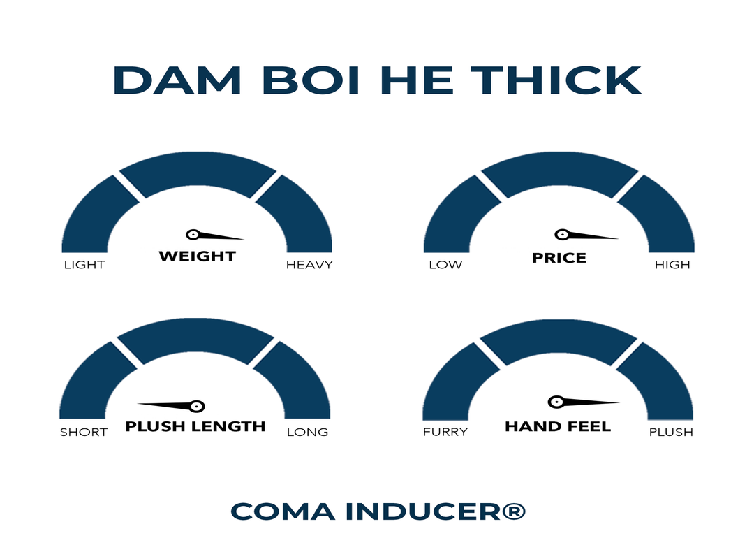 Inspired by the reaction you'll have when you encounter the thickest of thick Coma Inducer® comforters!! A comforter so thick that you can't utter any other words except, "Dam Boi He Thick®". At Coma Inducer®, we've been known for having oversized plush comforters. We've broken the barriers on softness levels, size levels (160" x 160"!), and now thickness levels!! Dam Boi He Thick® is not just a thick comforter, it's a bedding experience unlike anything you've ever seen, felt, or imagined. Touting a 1400 GSM fill rate doesn't just break our record, it shatters it!! To give you some perspective, the typical Coma Inducer® has a 280 GSM fill rate and most, if not all, other Coma Inducers are under 400 GSM. So when we add an extra 1000 GSM in fill weight, you know this is a THICK @SS BOI. What makes this Coma Inducer® even more impressive is that we didn't use just any filling. We used Grade A polyester, with a blown in technique to create a down alternative feel. Each square is like an over-filled squishy plush stuffed animal. We then coupled this THICK high quality filling with an outer ultra cozy plush that has a hand feel like petting the fluffiest cloud or a cuddly dog that had one too many meals. And that takes us full circle to the real naming inspiration which originated 3 years ago from a dog video that became an internet meme. Emily Flowers, a Coma Inducer® super fan, won the naming challenge for this Thickest of Thick Coma Inducers with her name suggestion; Dam Boi He Thick®. There were a lot of "normal" sounding names suggested, but when put to a vote, customers agreed that for a Coma Inducer® this special, it needed a name that was equally as attention grabbing... Dam Boi He Thick®!!!!