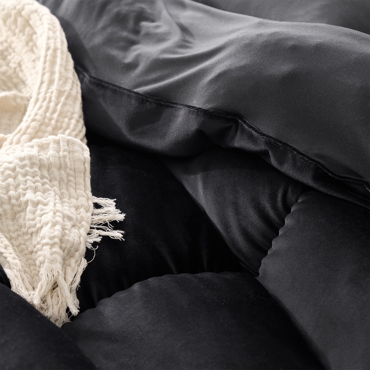 Inside the black 120" x 120" comforter, a thick 280 GSM comforter fill provides comforting medium weight comforter coziness. This affordable bedding piece brings smooth bedding texture and Alaskan King bed style together into one irresistibly soft comforter. The Fabric Fetish® Alaskan King Comforter in Black delivers Coma Worthy Sleep® every night.
