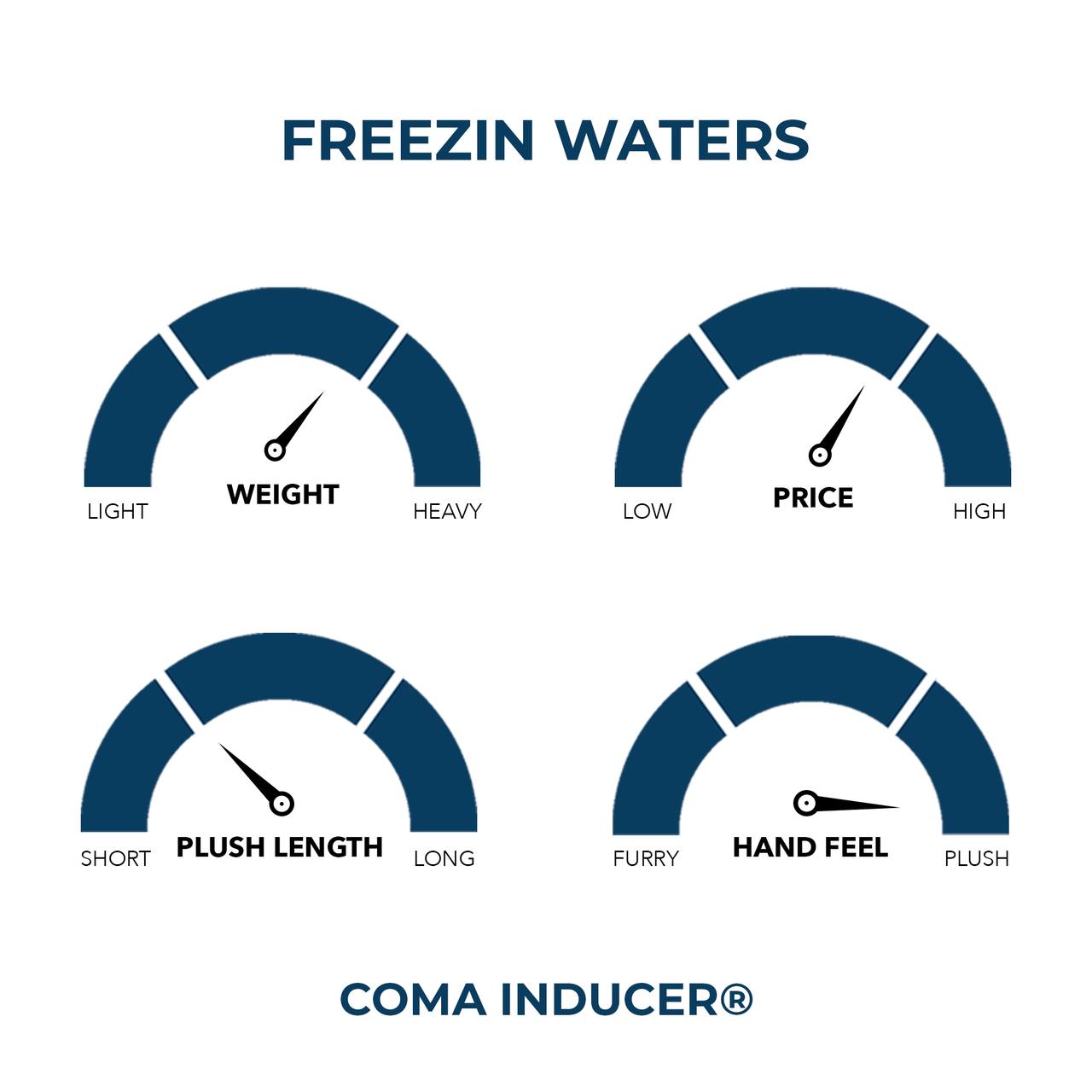 Inspired by the awe and beauty of watching bodies of water succumb to winter's wrath. Shifting from vibrant lakes, rivers, streams, and ponds to a frozen standstill of time, there is just something peacefully cozy about being comfortably indoors as Mother Nature transforms the world with wintery wonder. Our Freezin Waters Coma Inducer® is intentionally designed to look like icy cold streams starting to freeze over, making this beyond plush, frosted oversized comforter more than just a source of winter warmth, it's also a work of art. Made with 500 GSM of textured cozy plush that reverses to our baby blanket softness designed to caress your skin as you slip into Coma Worthy Sleep®. The combination of the overly thick Freezin Waters front with a thinner baby blanket reverse gives the perfect combination of warmth without overheating. If you used to dread winter, you can now look forward to its long nights and frigid temperatures as you stay snuggled up inside with your Freezin Waters Coma Inducer®.