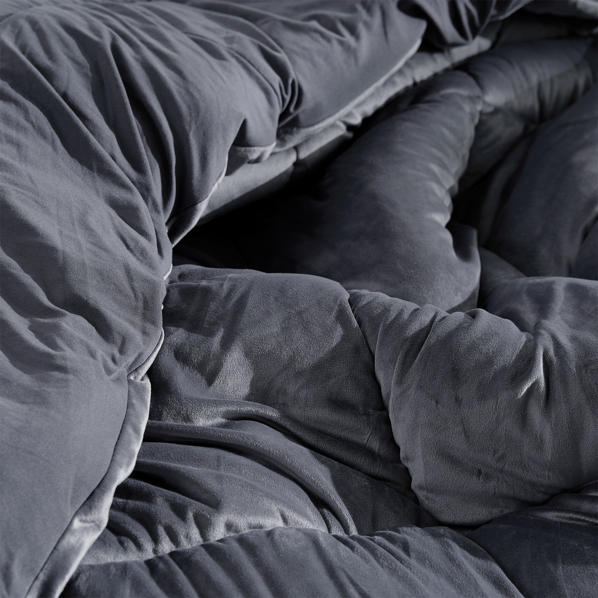 That’s because as a part of our Coma Inducer® premium bedding brand, you can expect a seriously high quality bedding experience with this extra large Full comforter. We don’t take any shortcuts or cut any corners when it comes to our designer Full oversized bedding, and this oversized Full comforter is no exception. This extra large Full bedding essential even features our signature oversized comforter dimensions, with extra length AND extra width to engulf your Full or Full XL mattress from top-to-bottom in a layer of snuggly softness. Not to mention, this gray Full oversized comforter also embodies a designer-quality style for an effortlessly chic look in your bedroom decor! With this plush gray velvet oversized Full XL comforter draped across your bed, you’ll be glad that you’re grown up enough to fully appreciate this cozy Full extra large comforter.