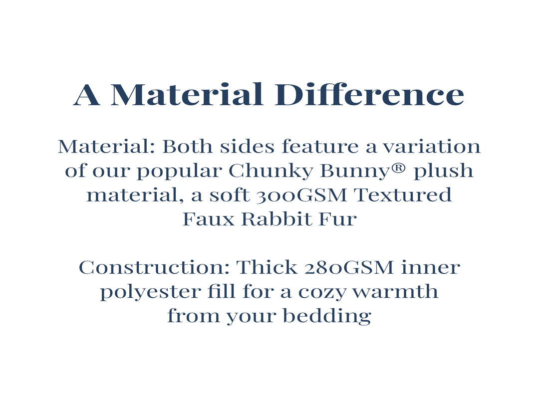 Inspired by our ability to poke a little fun at our Coma Inducer® options. There are some people that say "gosh, why do you make so many different types of Coma Inducers"? Sure, maybe we could make a few less, but that sounds boring. There are always new plush materials being developed and to ignore the latest and greatest kinda sounds lazy or even arrogant. Justa Nother® shows that no NEW Coma Inducer® is 'just another'. Each and every Coma Inducer® Plush Comforter is special and unique. In the case of Justa Nother®, this oversized plush comforter provides 300 GSM of Chunky Bunny® style faux rabbit fur in a textured pattern that will entice your sense of touch. Pushing the boundary of design aesthetics + cozy hand feel makes Justa Nother® far beyond 'just another' comforter. In general, each Coma Inducer® fits a certain type of personality or sleep type. In the world of comfort, we want you to know there is no plush left unturned. If it's soft, if it's cozy, if it feels like you might have to oversleep then Yes Yes and Yes, we are committed to always adding Justa Nother Coma Inducer® and many more styles for you to enjoy!