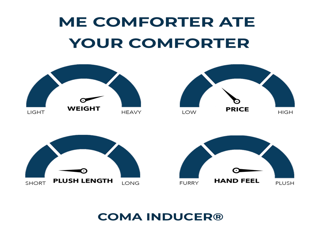 Inspired by 99% of comforters being pathetic. All those pathetic comforters made us think, "what if we had a Coma Inducer® that was so thick that it looked like it ate one (or many) of those pathetic comforters!?" At the very least, you'd get an idea that the thickness of this comforter is no joke! Our line of THICKEST Coma Inducer® comforters is something that's hard to imagine until you bring one home and compare it to what you formerly called a comforter. Me Comforter ATE Your Comforter® is over 1000 GSM of blown in down alternative filling that creates pillow-like sections of oversized goodness. Imagine a comforter that feels like 50 of the best down alternative squishy pillows stitched together. Now imagine that squishy thickness with an outer material consisting of our Original Coma Inducer® plush! The combination is heavenly to lay on top of and, when you lay under it on colder nights, you'll have the warmth and coziness that allows you to slip into Coma Worthy Sleep®.