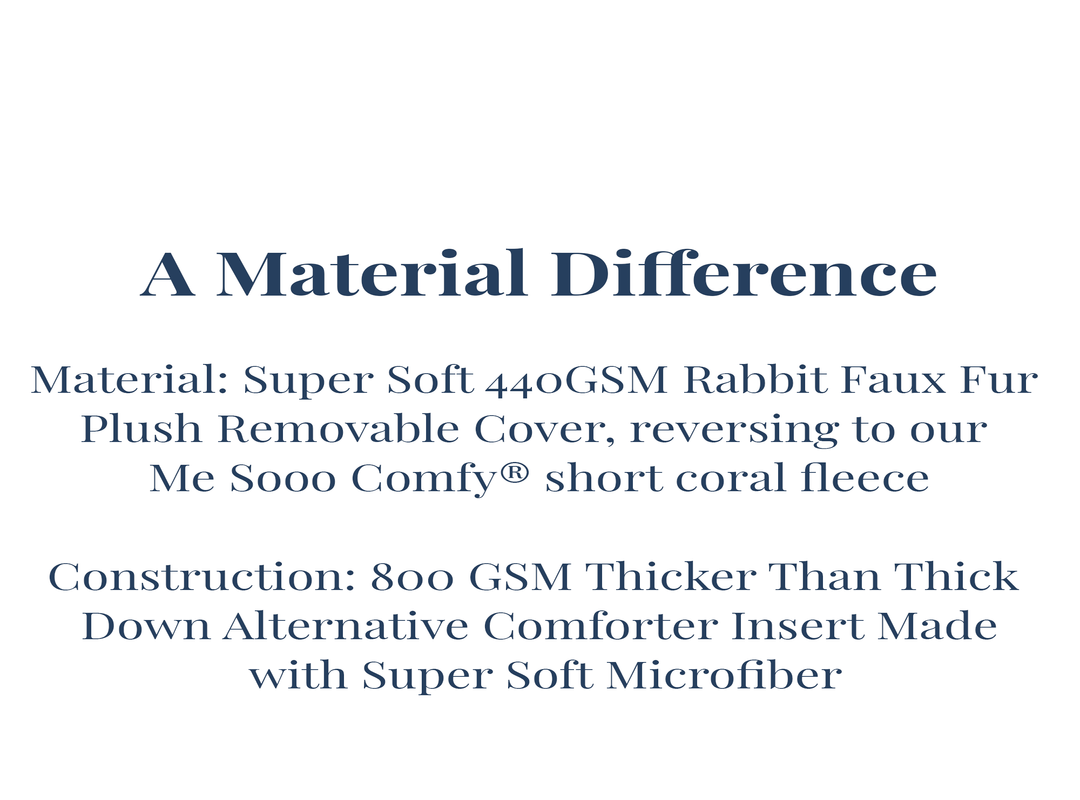 Inspired by pure overindulgence from your bedding. Designed around the concept of over-the-top comfort, Plumpy Pudgy Portly Chunky Bunny combines every element you would want in a comforter. Starting with the outer material, an unbeatable combination of our Chunky Bunny® 440 GSM rabbit faux fur and 220 GSM Me Sooo Comfy® coral fleece... it is impossible to touch this material and not have your expectations exceeded. Next, the thick inner fill of the comforter insert gives you the cozy and fluffy looking bedding you’ve always dreamed about. While machine washable, the included cloud-like ultra-thick comforter insert is sometimes too large to fit in home sized washing machines. For this reason, the product is designed with the outer Coma Inducer® plush cover that is easily removable and machine washable - which is essential to keeping your bedding clean and refreshed! And, to ensure everything stays in place, this duvet cover and comforter insert set is designed with loops and ties to easily attach the pieces together. All three elements; cozy soft outer material, thick plush inner filling, and practical removable cover combine to create bedding perfection unlike anything you’ve experienced before.