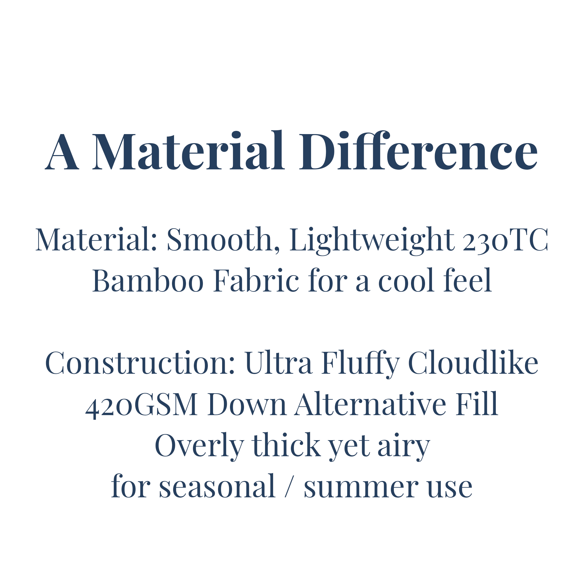 - Construction: Ultra Fluffy - Cloudlike 420GSM Down Alternative Fill - Overly thick yet airy for Seasonal / Summer.