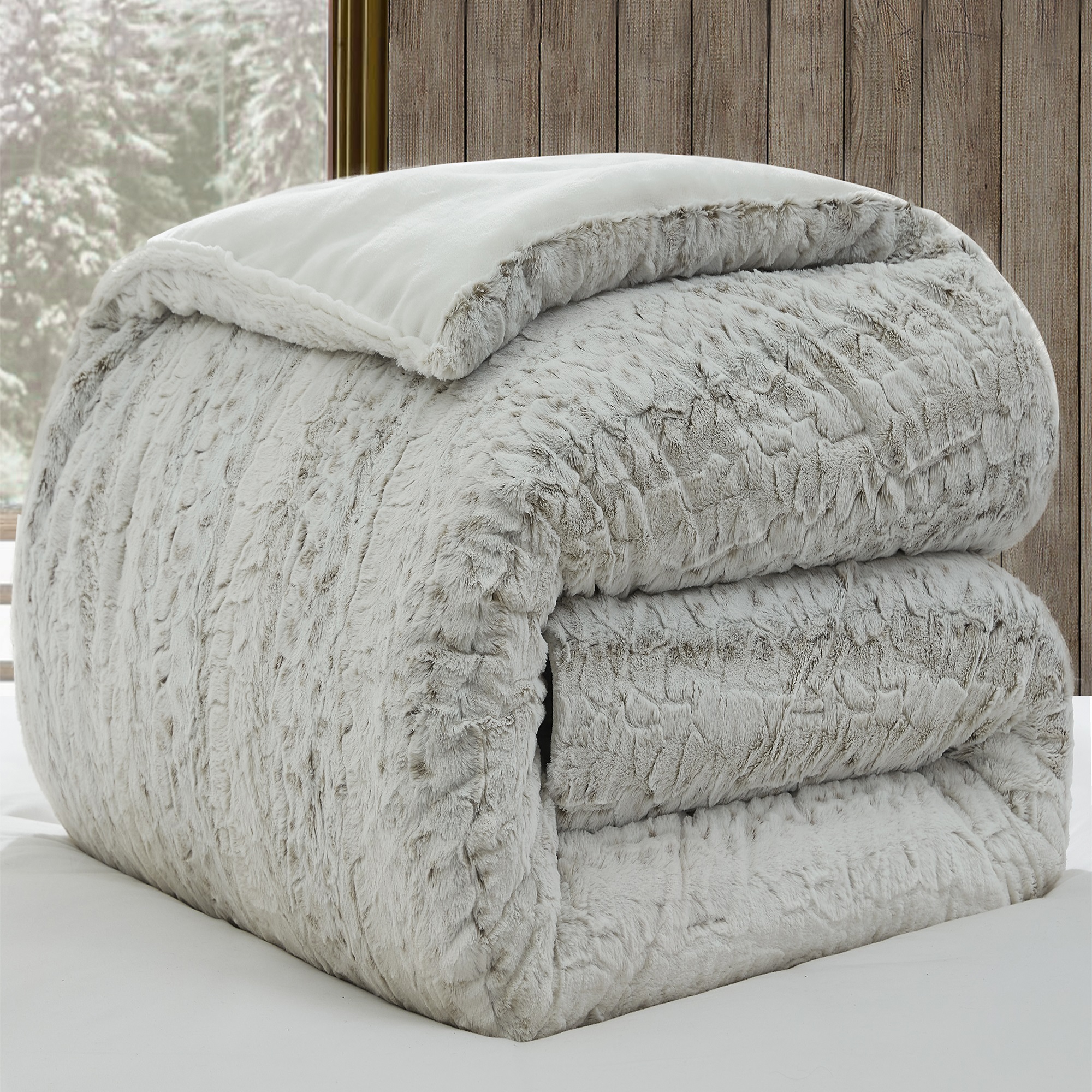 Inspired by a Snow Leopard. Hold up... hold up... you know we aren't that boring. If you know Coma Inducer®, then you know we like real, well thought out meanings. Snow Leopards aren't just beautiful animals with a great coat, they also have the ability to stand up to the worst of the worst winter conditions. Their thick, plush fur is the perfect inspiration for a Coma Inducer® comforter. Beauty combined with practical warmth has led to the creation of this one-of-a-kind Snow Leopard Coma Inducer®. This purr-fectly plush comforter is made with an incredibly thick 550GSM soft fur that reverses to short plush micro mink to create the ultimate bedding experience. Snow Leopards are rare, majestic animals and modeling this comforter after them just makes sense. Your bedding will be transformed with the help of the incomparable comfort of our Snow Leopard - Coma Inducer.