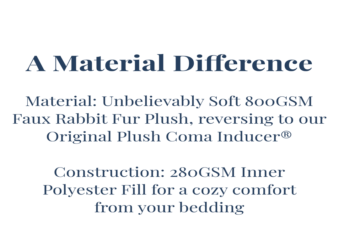 Inspired by the fun of winter. Winter's not all bad with cozy fireplaces, hot chocolate, skiing, and, of course, snuggling up in a Coma Inducer®. Dreaming of winter fun, we took our beloved Chunky Bunny® material and created a snowball-like textured pattern to give your bedroom the feeling of a winter wonderland. Utilizing an intensely soft 800 GSM rabbit-esque plush faux fur coupled with the Original Coma Inducer® material creates a comfort that will have you excited about winter. As the nights get darker earlier, you'll find more and more excuses to go to bed at hours so early, they seem unimaginable. It's true... but don't take our word for it, give our Snowball® Chunky Bunny Coma Inducer® a try and find out for yourself. Happy Winter. :)