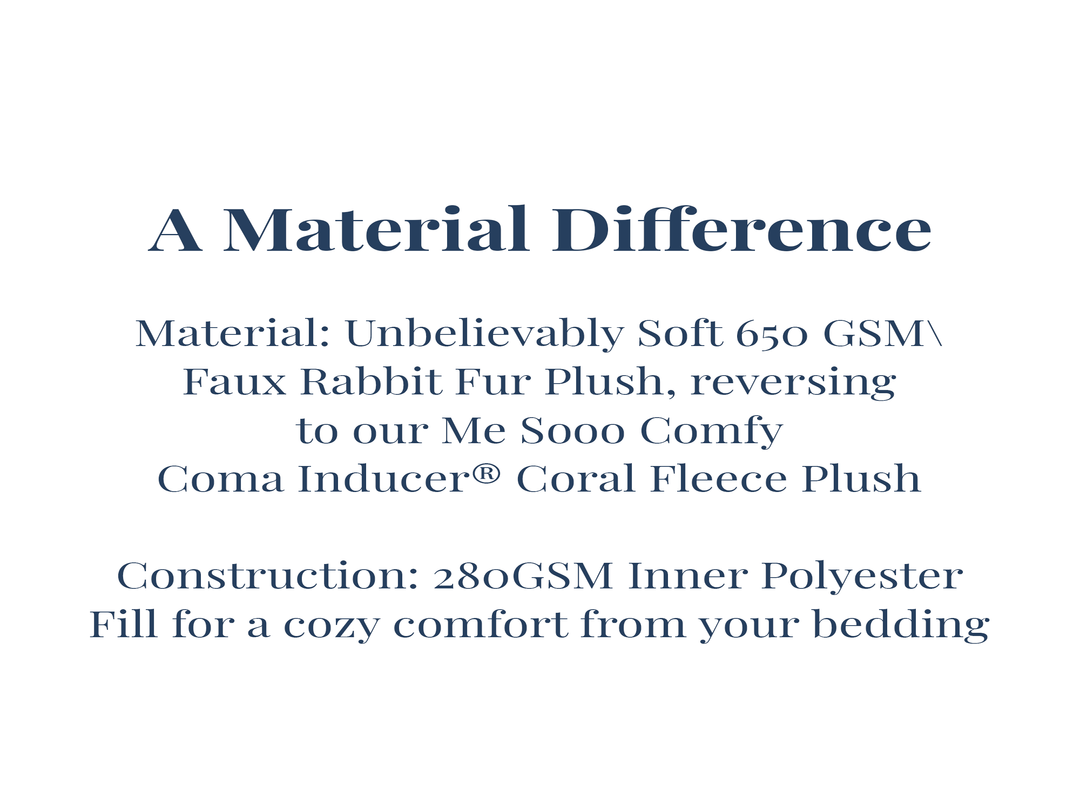 Inspired by the fun of winter. Winter's not all bad with cozy fireplaces, hot chocolate, skiing, and, of course, snuggling up in a Coma Inducer®. Dreaming of winter fun, we took our beloved Chunky Bunny® material and created a snowball-like textured pattern to give your bedroom the feeling of a winter wonderland. Utilizing an intensely soft 650 GSM rabbit-esque plush faux fur coupled with the Me Sooo Comfy Coma Inducer® material creates a comfort that will have you excited about winter. As the nights get darker earlier, you'll find more and more excuses to go to bed at hours so early, they seem unimaginable. It's true... but don't take our word for it, give our Snowball® Chunky Bunny Coma Inducer® a try and find out for yourself. Happy Winter. :)