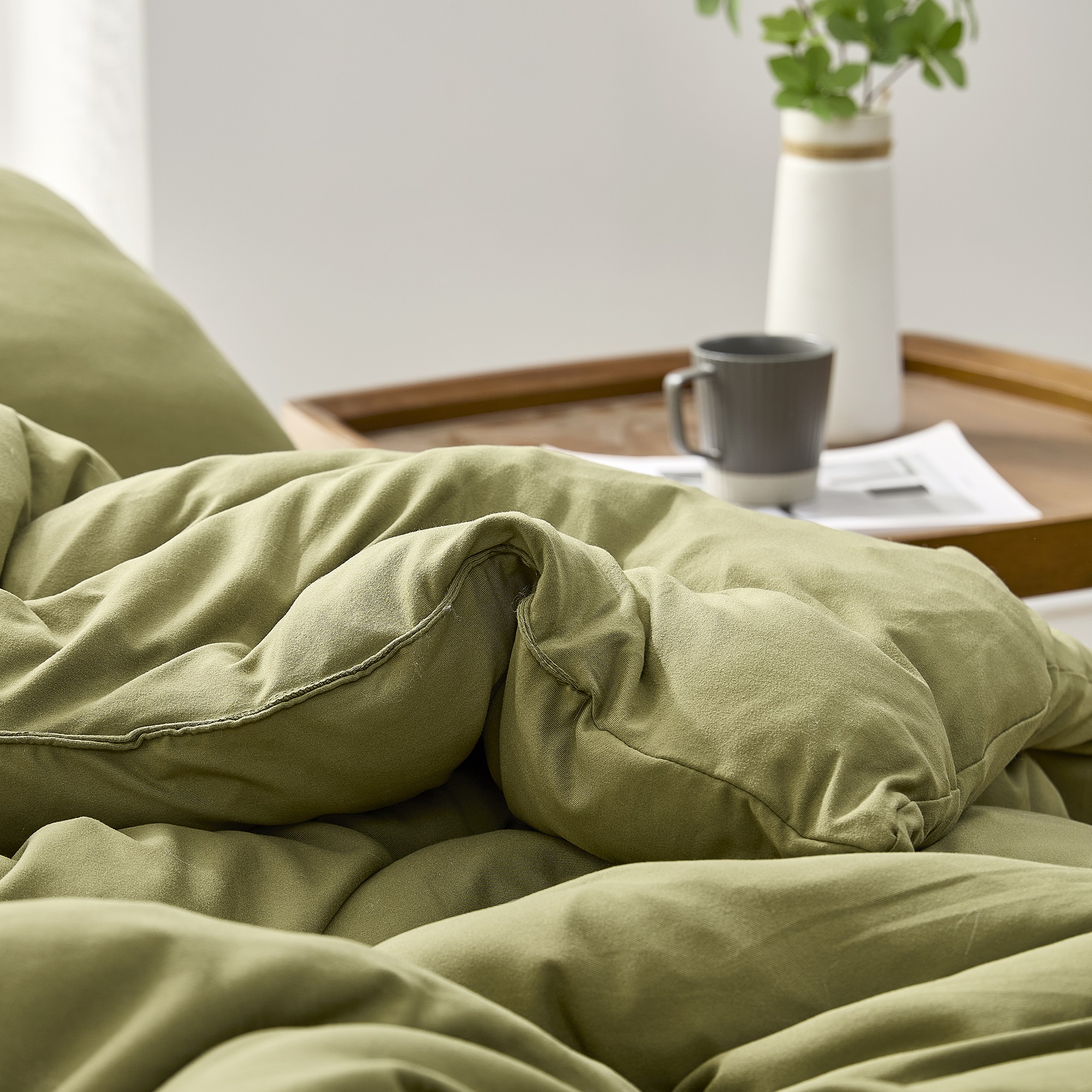 Looking for an olive-green, thick oversized King comforter set that doesn't overheat you in the summertime? Meet the Summertime Thick® Coma Inducer® oversized King comforter set in Olive Drab. This luxurious comforter features a double-sided super smooth fabric called Bare Bottom® that will make you feel like you're being caressed by a dolphin (but hopefully less wet). We found the perfect level of thickness for the filling of this cozy comforter with a 650 GSM cloud-like down alternative fill; you'll get to experience a delightful puffy, thick comforter without being weighed down of overheated.